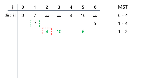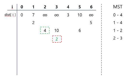 - 앞 단계에서 만들어진 MST 집합에 인접한 정점들 중에서 최소 간선으로 연결된 정점을 선택하여 트리를 확장한다.