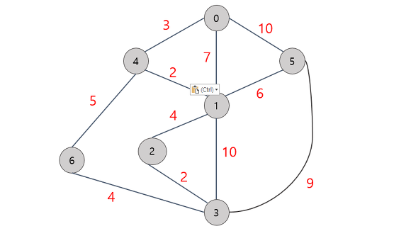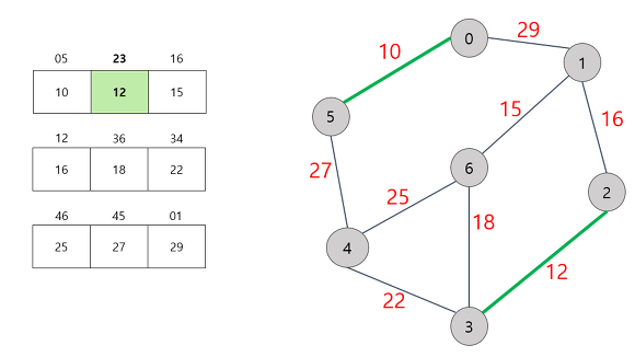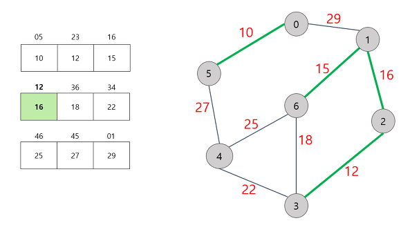 탐욕적인 방법(Greedy Algorithm)을 이용하여 네트워크의 모든 정점을 최비용으로 연결하는 최적 해답을 구하는 것
