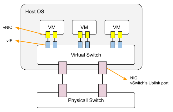 - 호스트 OS가 제공하는 물리닉도 함께 vSwitch에 묶이며, 이 경우 vSwitch의 uplink port가 된다.