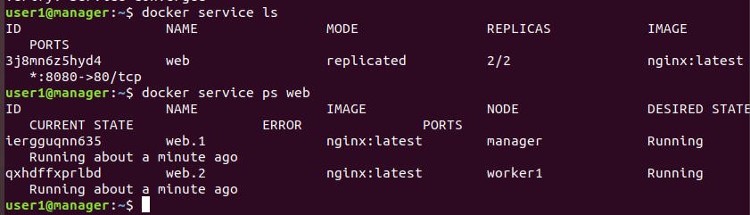 docker service create --replicas 2 -p 8080:80 --name web nginx docker service ls docker service ps web