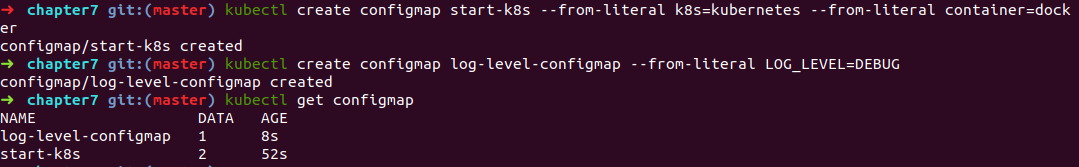 위 실행문은 log-level-configmap 에 변수 1개 / start-k83에 변수 2개를 설정해준 것이다.