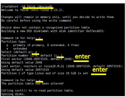 n (new 파티션) > P(기본) > 1(파티션 숫자는?) > enter(디스크의 크기를 몇부터 할당 받을래? 기본 2048) > w 저장