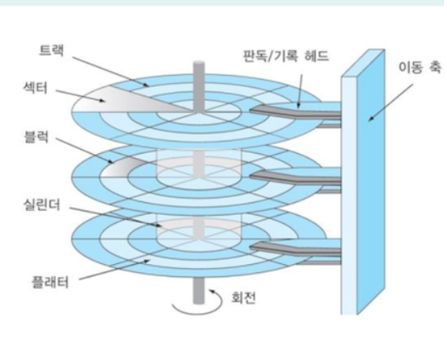 실린더 : 특정 트랙을 세로로 보면 같은 번호의 트랙이 여러 개 보인다. 이와 같이 플래터에 대해 동일한 위치에 있는 트랙의 집합을 실린더라고 한다.