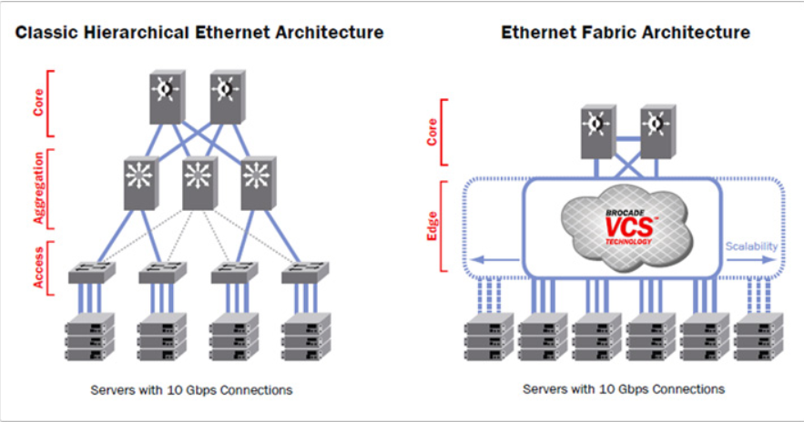 옛날에는 SPT를 이용해서 DataCenter를 구축을 Classic Hierarchical Ethernet Architecture 형태로 구축을 하였다. 하지만, 오늘날에는 Ethernet Fabric Architecture형태의 DataCenter를 구축을 하였다.