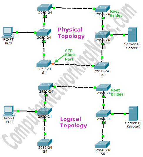 STP가 동작을 시작하면 위의 Topology와 같은 물리적으로 Loop 구조인 Network에서 특정 Port를 차단 상태로 바꾸어 놓음으로써 논리적으로 Loop가 발생하지 않게 한다. 그러다 다른 동작중인 스위치의 Port가 Down되면 차단 상태로 바꿔놓은 특정 Port를 다시 전송 상태로 바꾸어 통신이 끊기지 않도록 한다. 그 Loop를 막는 경로를 구성하는 프레임을 BPDU(Bridge Protocol Data Unit)라고 한다.