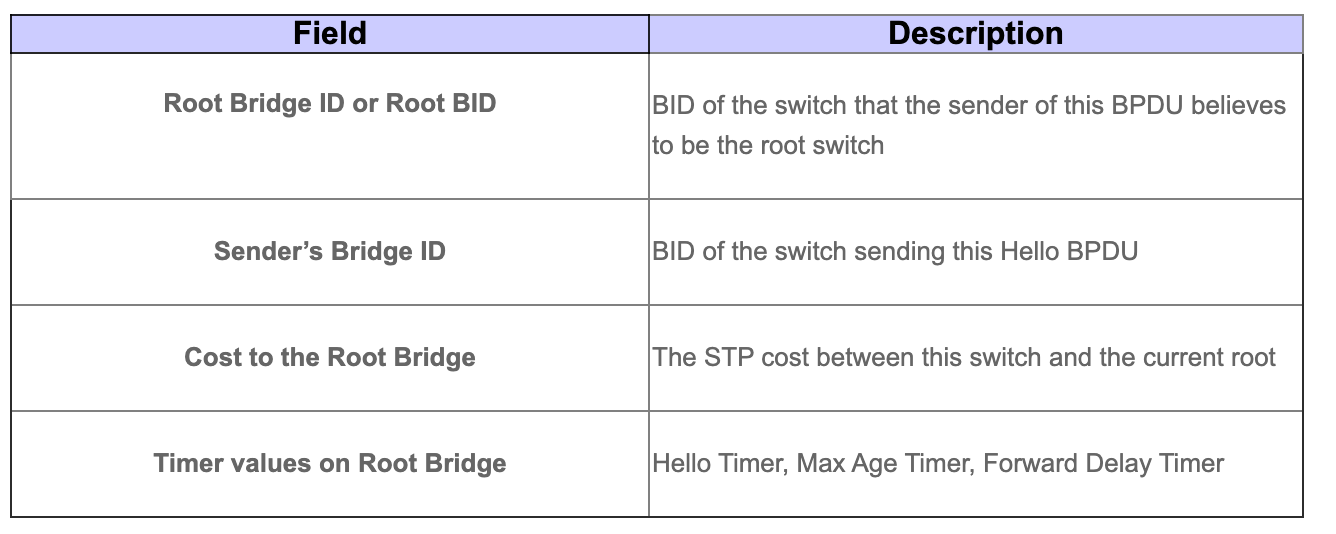 Configuration BPDU에는 Bridge ID, Root Bridge ID, 경로값, Port ID 등과 Timer등이 포함되어 있다.