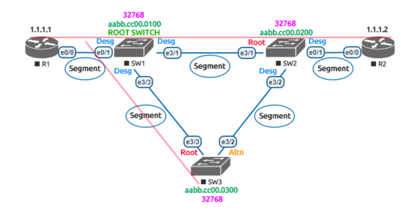 이러한 방식으로 SW2와 SW3는 BID가 10인 스위치를 Rootswitch로 인식하고 SW2와 SW3의 Port를 닫아 버린다.