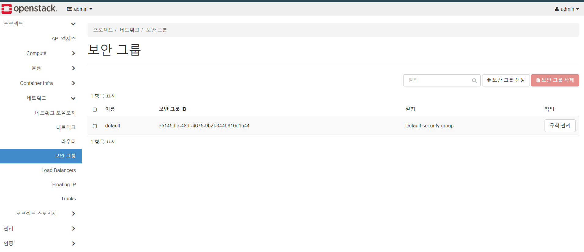 오픈스택사이트(211.183.3.100) > 로그인(demo) > 프로젝트 > 네트워크 > 보안그룹 > 보안그룹생성